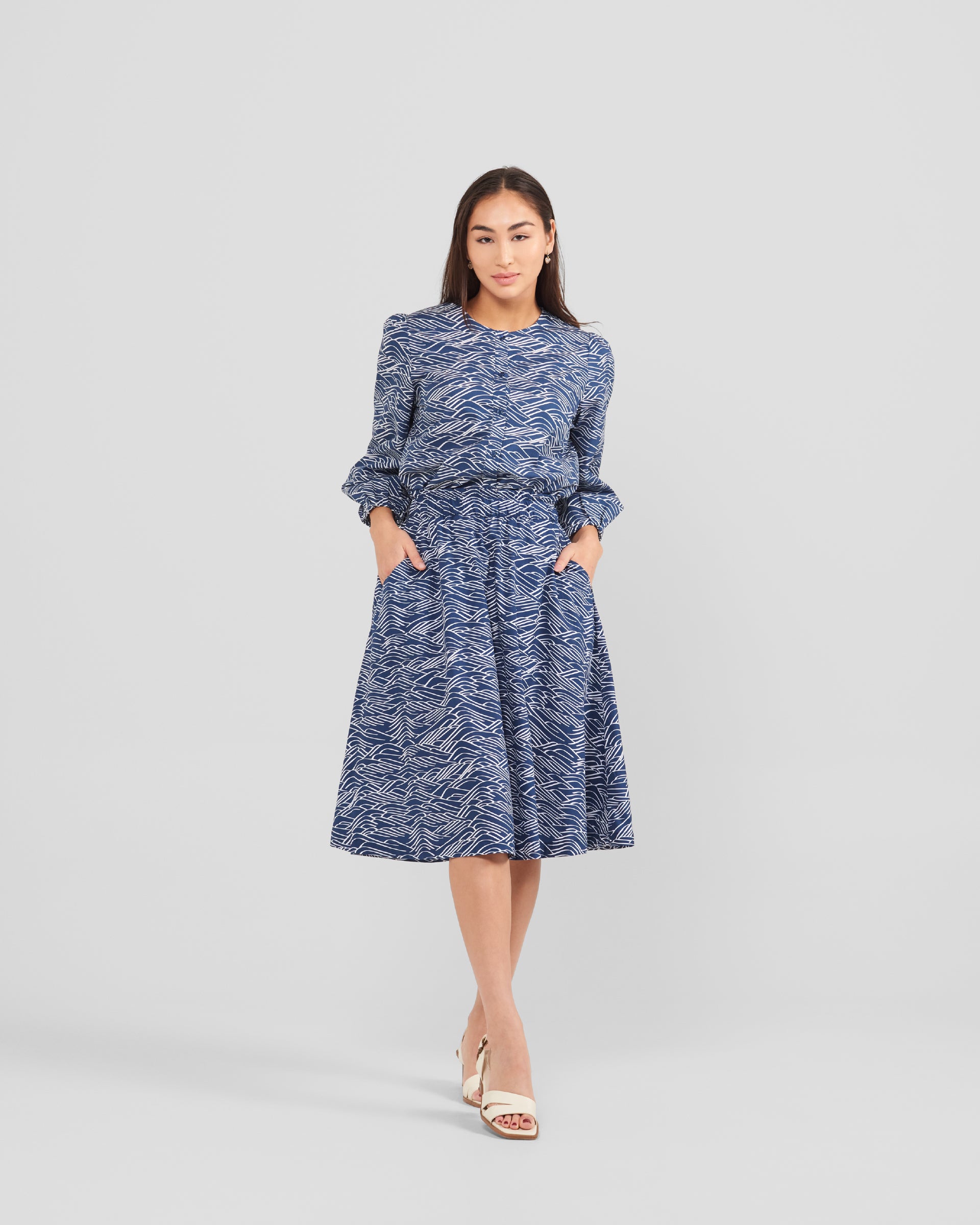 Elevate your everyday style with our women's puff sleeve blouse, featuring a vibrant, hand-drawn Big Waves print that's exclusive to our limited-edition collection. Crafted from 100% peached cotton and woven with a durable poplin weave, this women’s blouse offers a smooth, soft finish that feels as good as it looks.