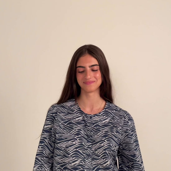 Discover our women's round neck, puff sleeve blouse with a hand-drawn Big Waves print, crafted from 100% Peached Cotton using a durable Poplin weave.